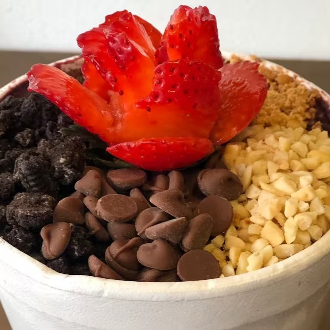 Delicioso Açaí 100% fruta. Você monta do seu jeito, podendo escolher até 3 itens que vão dentro do Açaí.
