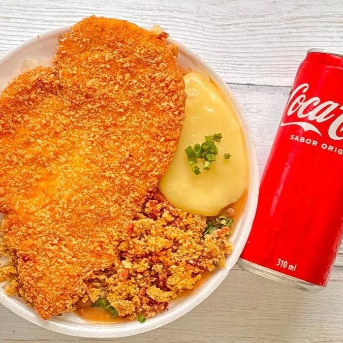 Marmita com delicioso filé de frango empanado na farinha panko, acompanhado de arroz branco, feijão, farofa e E Purê De Batata. Acompanha refrigerante Coca-Cola zero 310ml bem gelado. Marmita indicada para 01 pessoa.