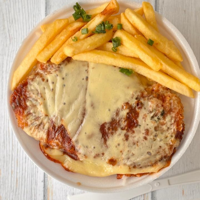 Filé de frango à parmegiana e acompanha Arroz, Feijão e Batata Frita