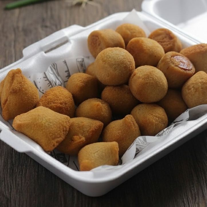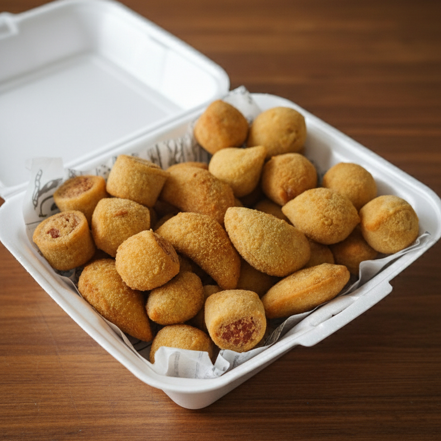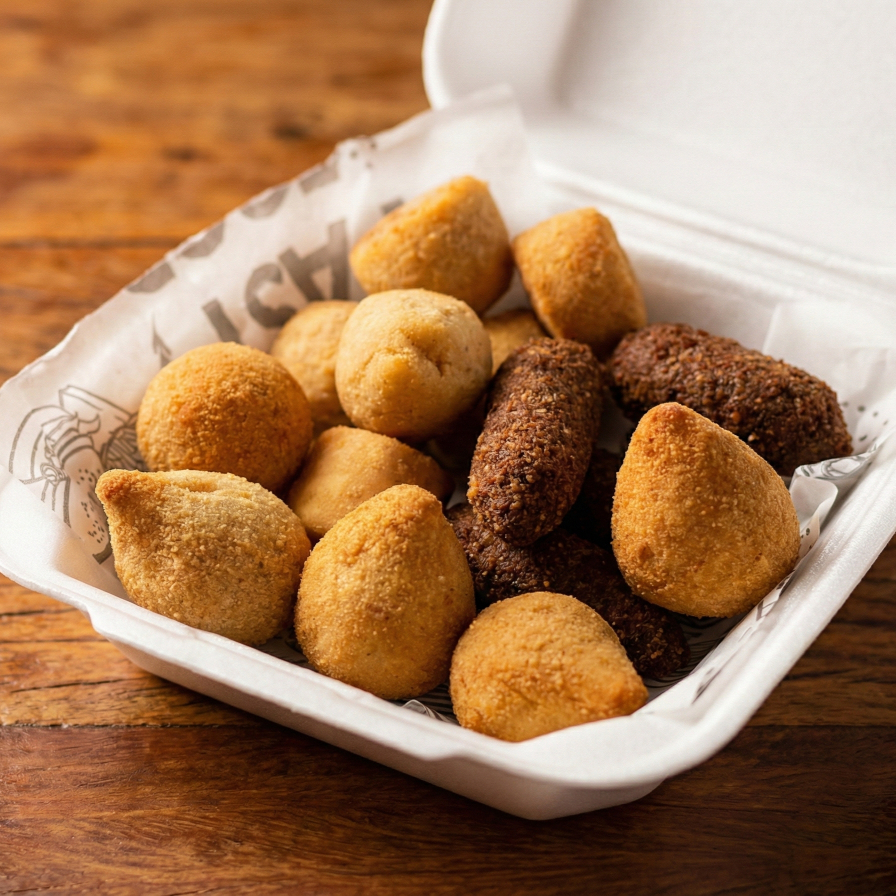 Kit Com 25 Deliciosos Salgados: 10 Quibes + 10 Bolinhas de Calabresa + 5 Coxinhas de Frango. (Salgados tamanho festa, fritos na hora). Aproveite: Adicione + 10 Salgadinhos Com Descontão!