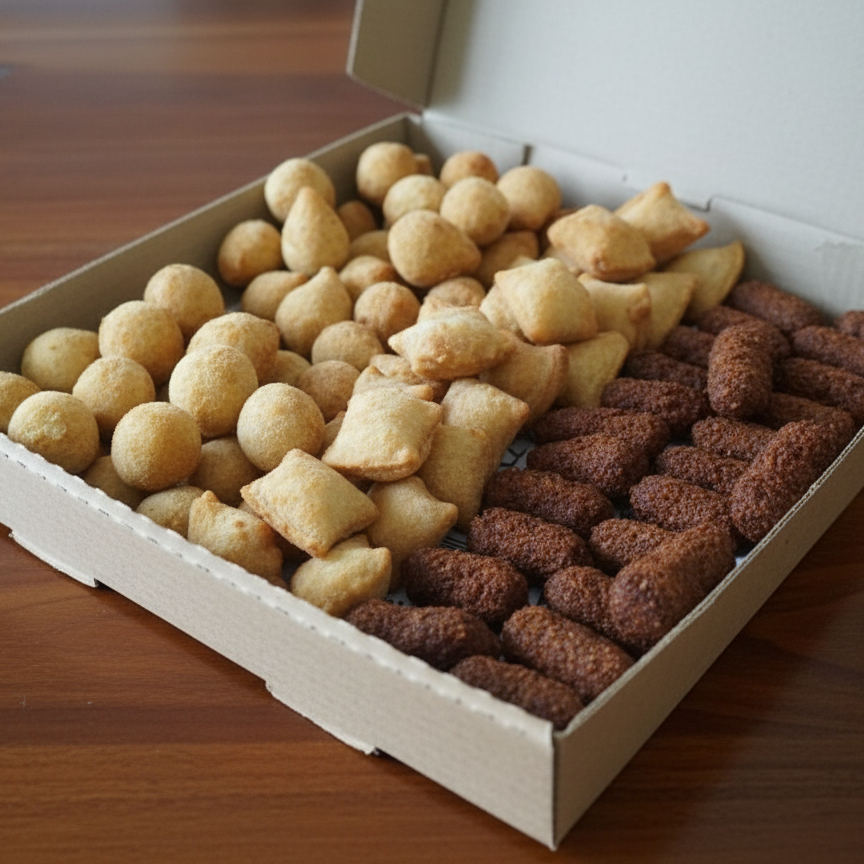 Kit Com 100 Deliciosos Salgados (Tamanho Festa). Escolha Até 4 Sabores, Temos: Coxinha De Frango, Risole De Queijo e Presunto, Kibes, Bolinhas De Calabresa, Churros, Enroladinho De Salsicha. Aproveite e Adicione Outro Kit Igual Com Descontão!