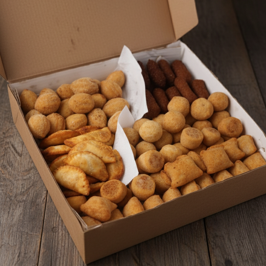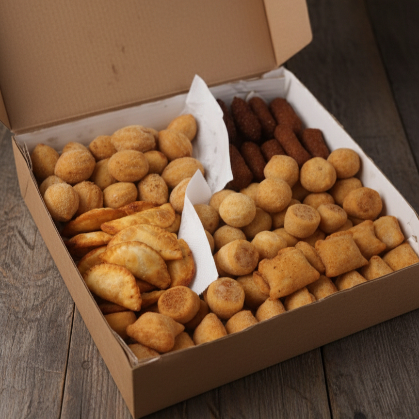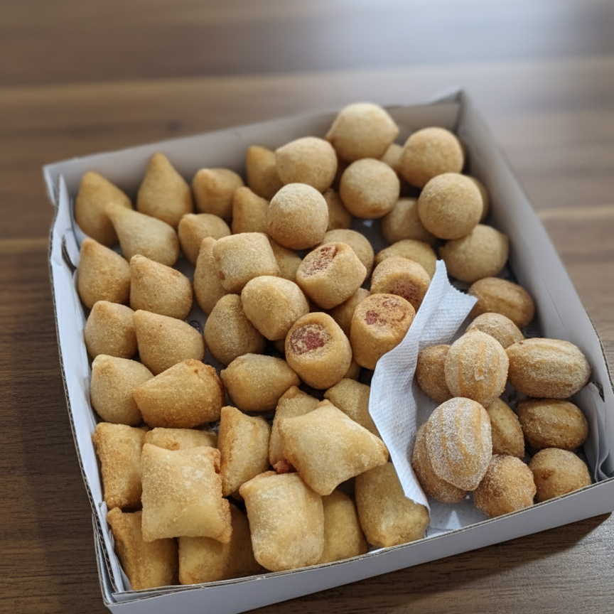 Kit Com 50 Deliciosos Salgados (Tamanho Festa). Escolha Até 5 Sabores, Temos: Coxinha De Frango, Risole De Queijo e Presunto, Kibes, Bolinhas De Calabresa, Churros, Enroladinho De Salsicha. Aproveite e Adicione Outro Kit Igual Com Descontão!