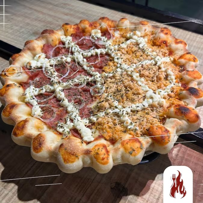 Saboroso 'Trio': Pizza Grande com 2 irresistíveis sabores, totalizando 8 fatias generosas, acompanhada de uma apetitosa borda recheada, disponível em 3 opções para seu deleite.