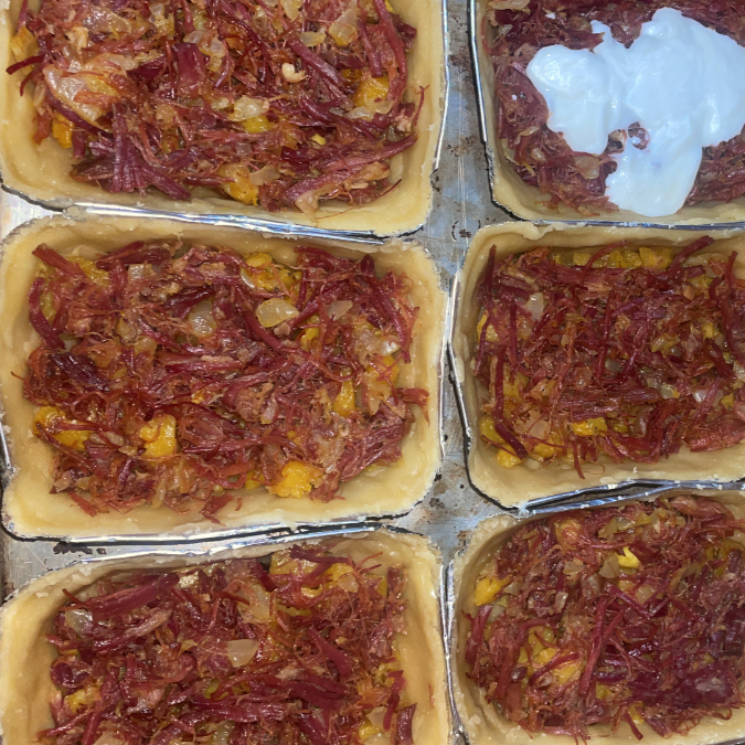 Sabor irresistivel com charque desfiada e acebolada com banana da terra caramelizada.