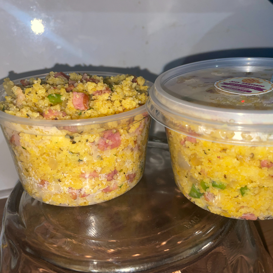 Delicioso cuscuz temperado serve duas pessoas. Contém calabresa frita, bacon, cebola, pimentão,coentro e orégano