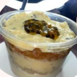 mousse de maracujá, 4 leite, massa de baunilha e 250ml cada pote que serve 2 pessoas.