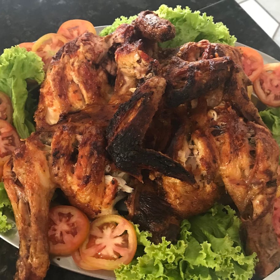 Frango inteiro assado na brasa.