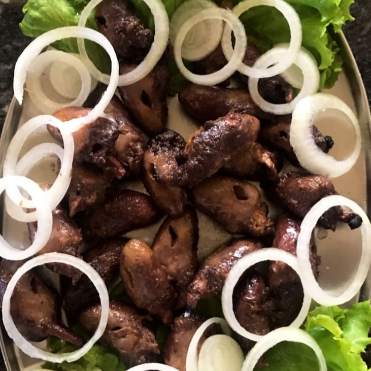 Coração de frango assado na brasa. Acompanhamentos: farofa e salada vinagrete.