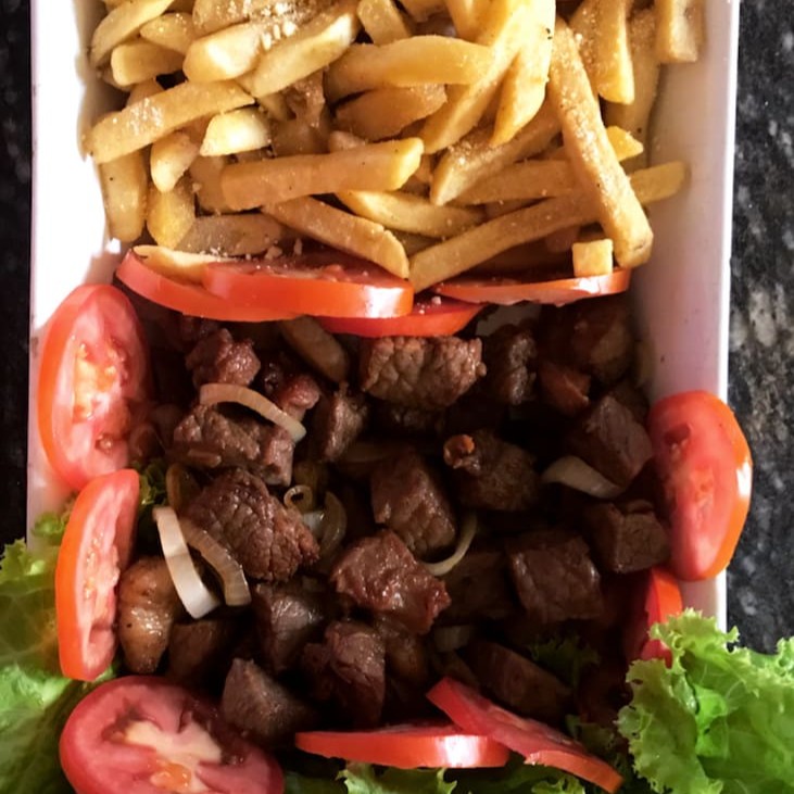 Filé especial acebolado assado em tiras, acompanhado com batatas fritas.
