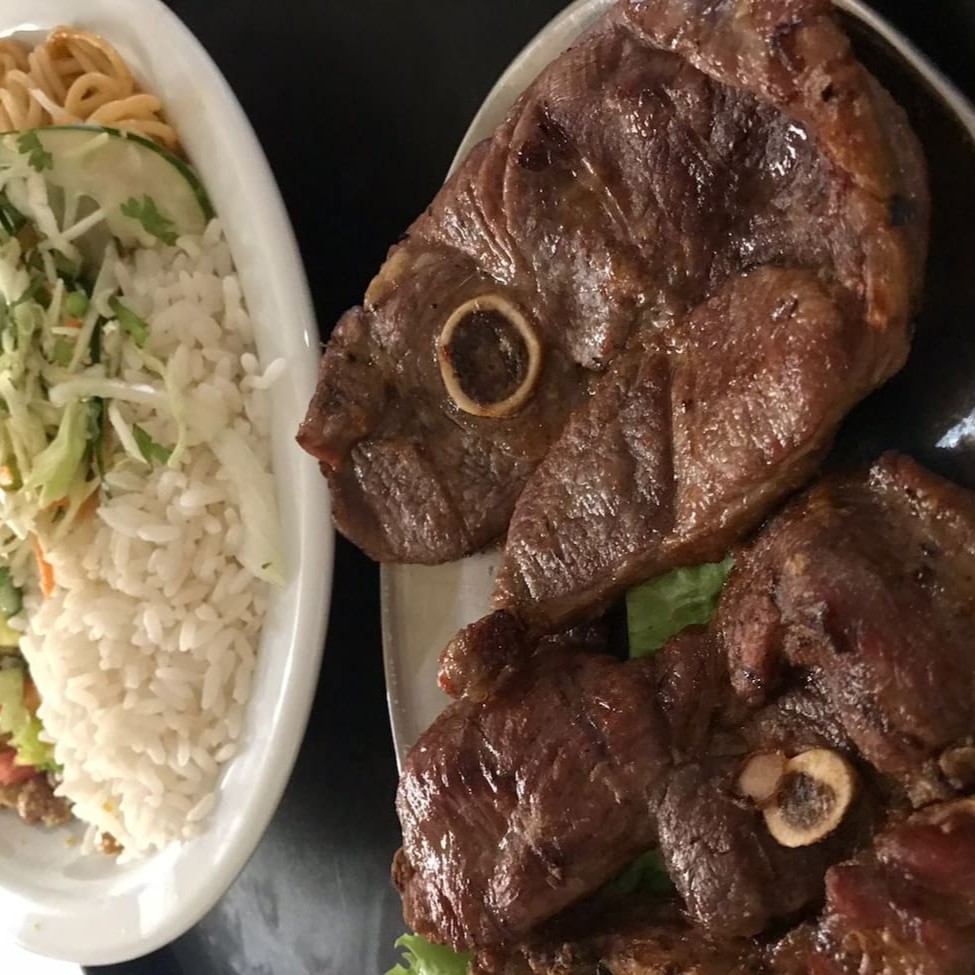 2 fatias de carneiro Acompanhamentos: farofa e salada vinagrete.