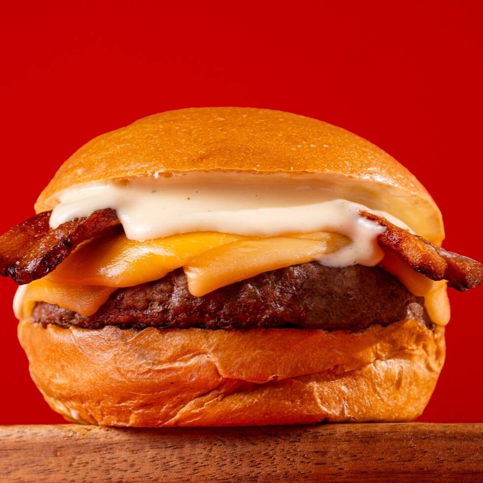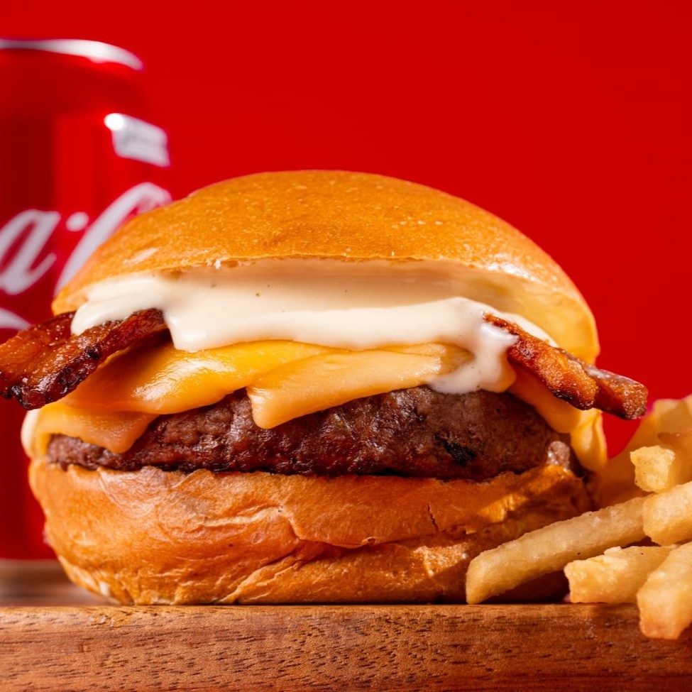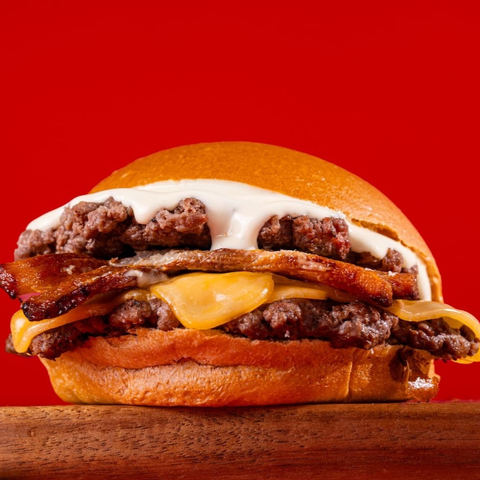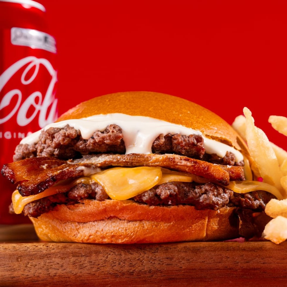 Dois smash burgers com queijo prato, bacon crocante e maionese defumada no pão brioche. Uma combinação suculenta e marcante pra quem ama bacon!