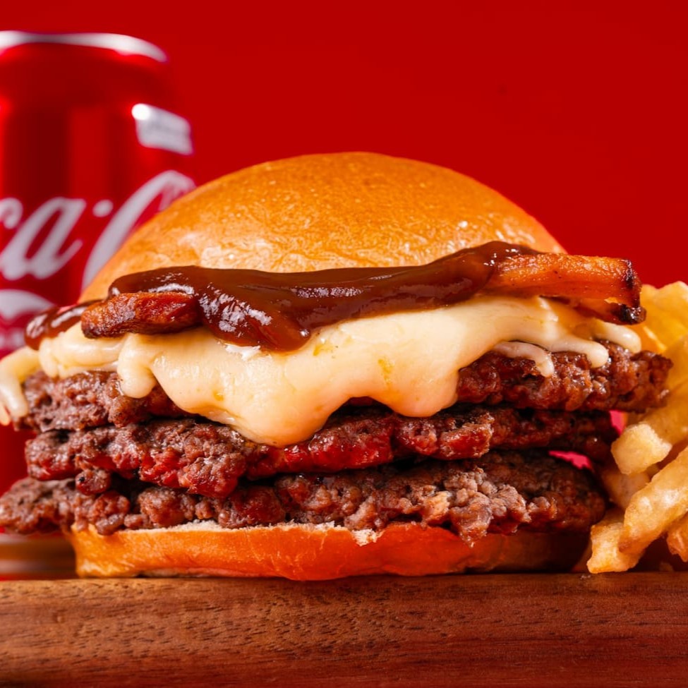 Três burgers smash (3x 60g), queijo mussarela derretido, bacon em tiras crocantes e molho barbecue artesanal, no pão brioche macio e tostado. Acompanha: Porção de batata frita + Refrigerante lata