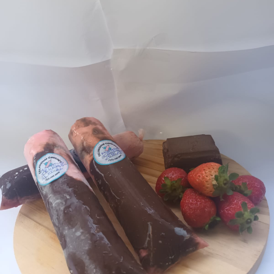 Delicioso geladinho goumert recheado com geleia natural de morango.