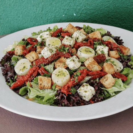 (Aprox. 350g) Um mix de folhas frescas e crocantes serve de base para uma combinação elegante e cheia de sabor. O tomate seco traz sua intensidade marcante, enquanto o palmito adiciona leveza e delicadeza. A ricota temperada entra cremosa e aromática, equilibrando o prato com suavidade. Tudo é cuidadosamente regado com um perfumado azeite de ervas e finalizado com croutons dourados que entregam a crocância perfeita. Leve, sofisticada e cheia de personalidade — uma salada que transforma simplicidade em experiência.