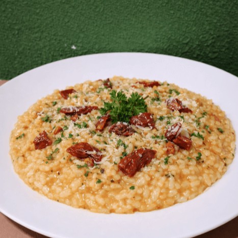 (Aprox. 350g) Cremoso na medida certa e cheio de personalidade. O arroz arbóreo é preparado lentamente até atingir a textura perfeita, enquanto o tomate seco traz seu sabor marcante e levemente adocicado, criando um contraste irresistível a cada colherada. O resultado é um prato aromático, equilibrado e envolvente, onde cada ingrediente se destaca sem perder a harmonia. Um risoto elegante, intenso e surpreendentemente saboroso.