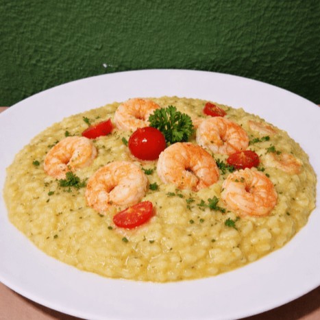 (Aprox. 350g) Delicado, cremoso e cheio de sabor do mar. O arroz arbóreo é preparado lentamente até alcançar a cremosidade perfeita, absorvendo cada nuance do caldo e dos temperos. Camarões suculentos entram na finalização, trazendo aroma, textura e um toque sofisticado ao prato. Cada colherada entrega equilíbrio, intensidade e elegância em um risoto que conquista pelo sabor e pela delicadeza. Um clássico refinado para quem aprecia frutos do mar.