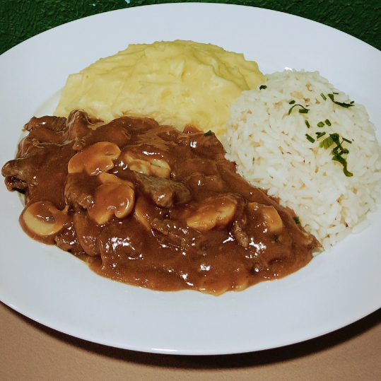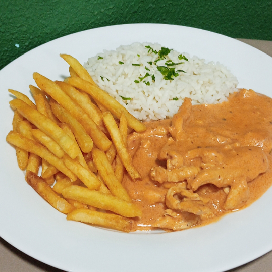 (Aprox. 400g) Cremoso, aromático e cheio de sabor. Escolha a proteína que mais combina com você — frango, filé mignon, filé de carne ou camarão — preparada em um molho estrogonofe rico e envolvente que transforma cada garfada em puro conforto. Servido com os clássicos que não podem faltar: arroz soltinho e batatas fritas crocantes, criando a combinação perfeita entre cremosidade e crocância. Um prato clássico, generoso e feito para agradar todos os paladares.