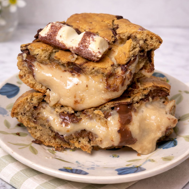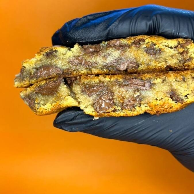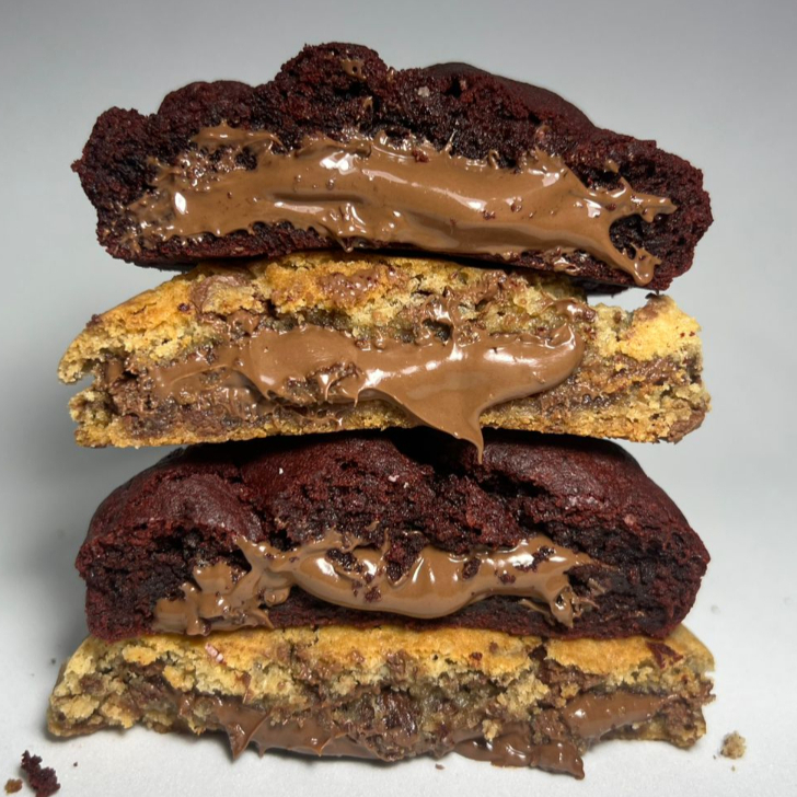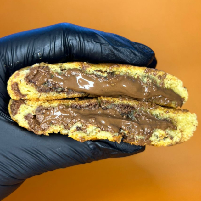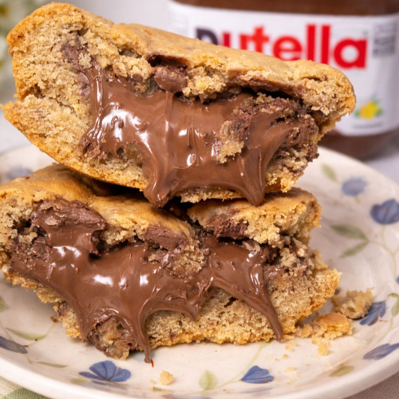 Massa de cookie clássica com chocolate ao leite, recheado com Nutella cremosa que derrete a cada mordida.