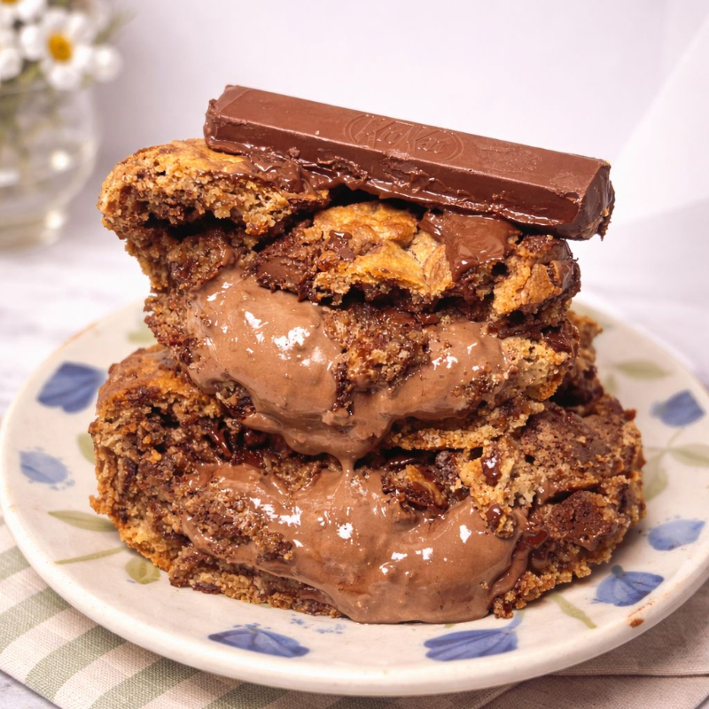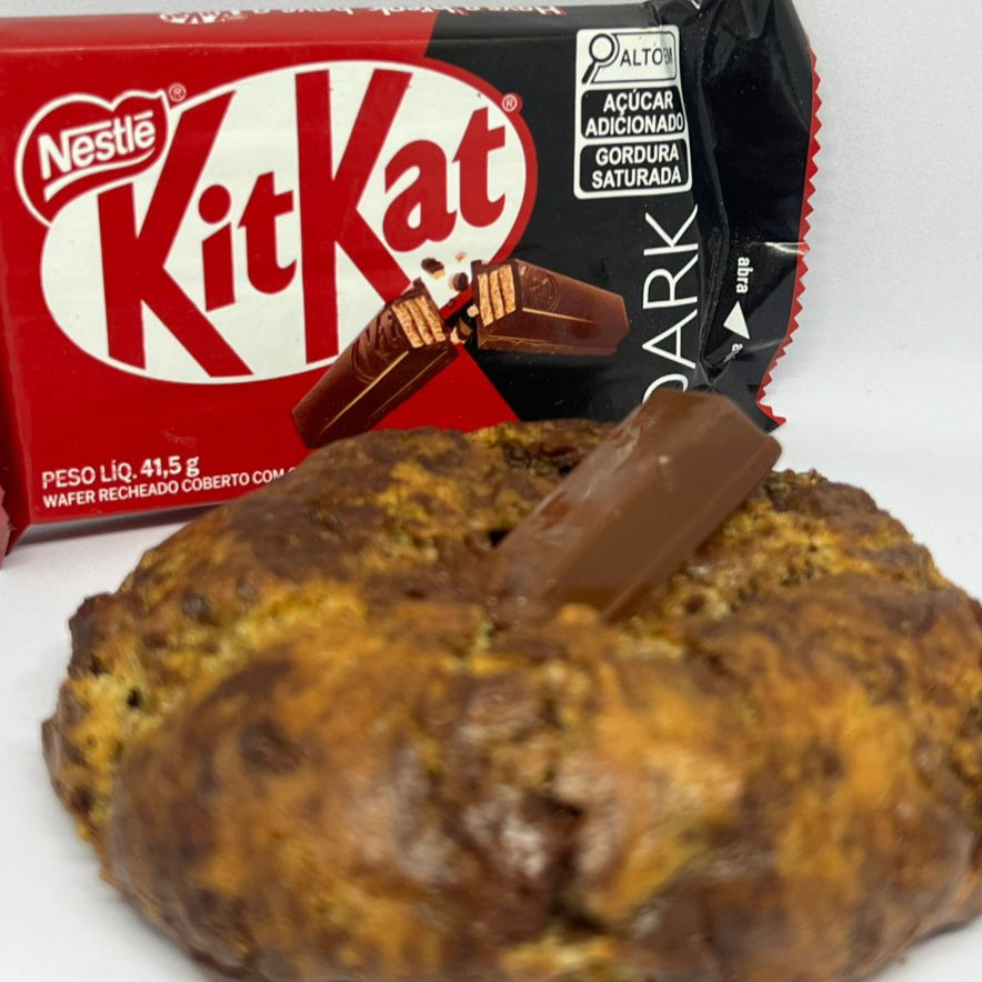 Massa de cookie clássica com pedaços de KitKat Dark, recheado com um creme de KitKat ao leite super cremoso.