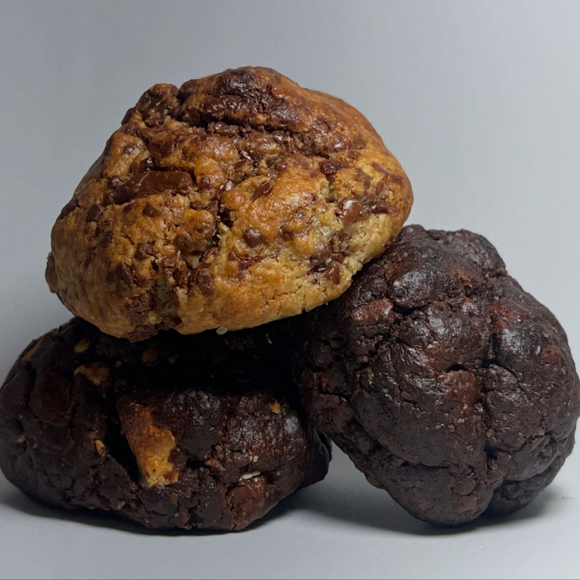 1 cookie tradicional com gotas de chocolate; 1 cookie tradicional com Nutella; 1 cookie Nyc Nuts.