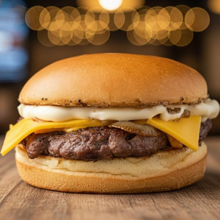 Composição: Pão Brioche, smash de carne 120g, 1 queijo, cebola na chapa, maionese. Descrição: Smash burger de 100g prensado na chapa, com queijo derretido, cebola feita na chapa e maionese cremosa, servido no pão macio. Um hambúrguer simples, aromático e muito saboroso. tags cheeseburger onion, smash burger, smash 100g, burger com cebola, hambúrguer artesanal, cebola na chapa, burger simples, queijo derretido, hambúrguer suculento, lanche artesanal, burger chapado, hambúrguer delivery, lanche rápido, burger clássico, hambúrguer sem salada, maionese cremosa, burger caseiro, fast food artesanal, hambúrguer popular