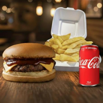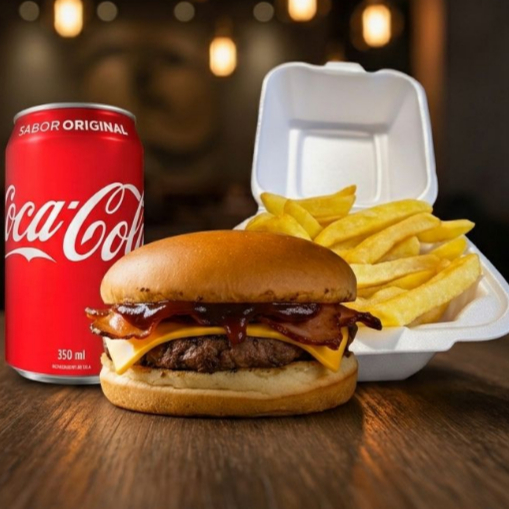 Pão brioche, Blend smash suculento, Queijo cheddar, Bacon, Mollho barbecue. Batata crocante. Coca