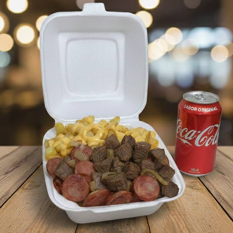 Batatas crocantes, carne do sol suculenta, calabresa selecionada e cheddar em dobro escorrendo por cima. Toque final de cebola para equilibrar sabores. Acompanha Coca-Cola gelada. Um combo robusto, pensado para quem quer mais do que matar a fome — quer escolher bem. Valeriano Legado. Obs: Se não tivermos a Coca-cola mandaremos Fanta.