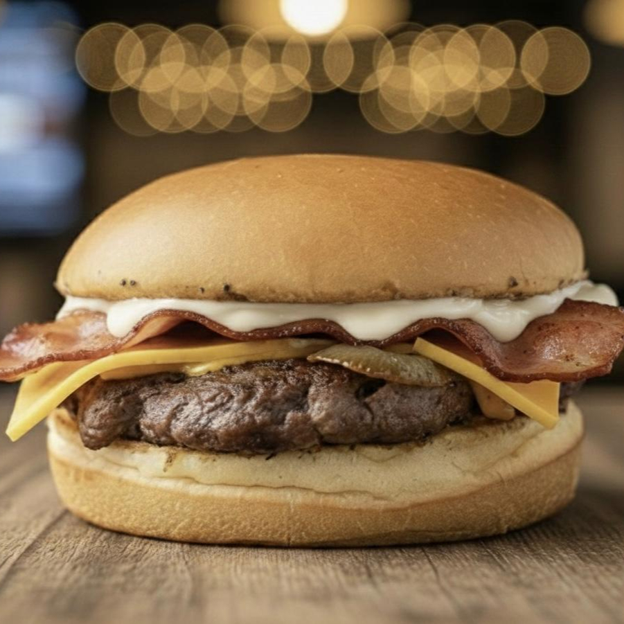 Composição: Pão Brioche, smash de carne 120g, 1 queijo, bacon crocante, maionese. Descrição: Smash burger de 100g prensado na chapa, com queijo derretido, bacon crocante e maionese cremosa, servido no pão macio. Um burger simples, suculento e cheio de sabor. tags cheeseburger bacon, smash burger, smash 100g, burger com bacon, hambúrguer bacon, bacon crocante, burger artesanal, hambúrguer suculento, queijo derretido, maionese cremosa, lanche premium, burger chapado, hambúrguer delivery, lanche artesanal, hambúrguer sem salada, burger clássico, bacon lovers, burger simples, fast food artesanal, hambúrguer caseiro