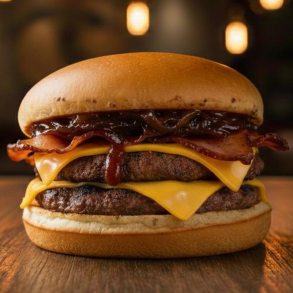 Composição: Pão Brioche, 2 smash burgers de 120g cada, 2 queijos, bacon em dobro, cebola na chapa, molho barbecue. Descrição: Duplo smash burger com duas carnes de 100g prensadas na chapa, queijo em dobro, bacon crocante, cebola caramelizada na chapa e molho barbecue defumado. Um hambúrguer forte, suculento e extremamente marcante. tags hambúrguer duplo, duplo smash, smash burger duplo, smash 100g, duplo bacon, burger parrudo, hambúrguer artesanal, burger com cebola, cebola caramelizada, molho barbecue, burger defumado, lanche premium, hambúrguer robusto, burger suculento, bacon em dobro, queijo em dobro, hambúrguer sem alface, burger chapado, lanche reforçado, burger delivery
