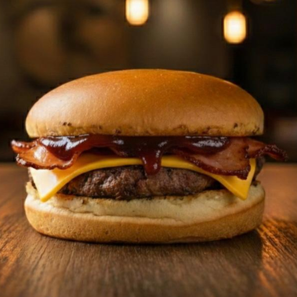 Composição: Pão Brioche, smash de carne 120g, 1 queijo, bacon crocante, molho barbecue. Descrição: Smash burger de 100g prensado na chapa, com queijo derretido, bacon crocante e molho barbecue defumado, servido no pão macio. Um hambúrguer marcante e cheio de personalidade. tags burger barbecue, smash burger, smash 100g, hambúrguer barbecue, burger defumado, bacon crocante, hambúrguer artesanal, molho barbecue, burger suculento, lanche premium, hambúrguer sem alface, burger chapado, lanche artesanal, hambúrguer delivery, burger intenso, fast food artesanal, hambúrguer caseiro, burger clássico, lanche saboroso, bacon lovers