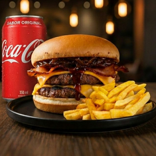 - COMBO BURGER SUPREMO DUPLO - Pão brioche macio e levemente amanteigado envolvendo dois (smash burgers blend 120g cada), prensados no ponto certo para formar aquela crosta irresistível. Duas camadas de queijo derretendo, bacon em dobro, cebola caramelizada trazendo equilíbrio adocicado e molho barbecue marcante finalizando cada mordida. Acompanha batata frita crocante e Coca-Cola gelada. Um combo robusto, intenso e pensado para quem valoriza sabor de verdade. Aqui cada ingrediente tem presença — e o que você vê é exatamente o que recebe. 🍔 240g de carne 🥓 Bacon em dobro 🧅 Cebola caramelizada 🍟 Batata crocante 🥤 Coca 350ml Não é exagero. É construção de sabor. Obs: Se não tivermos a Coca-cola mandaremos Fanta.