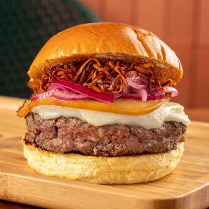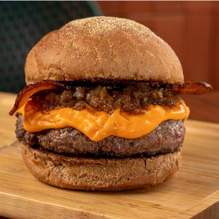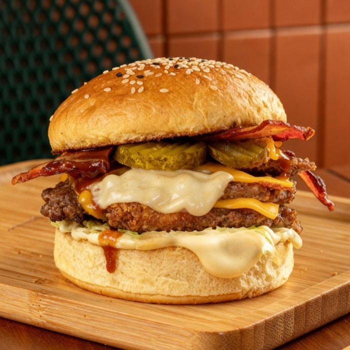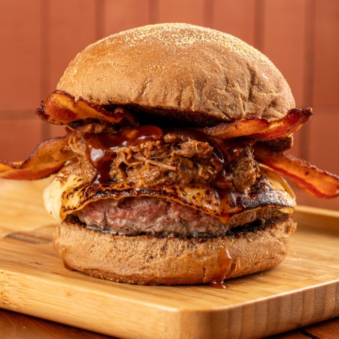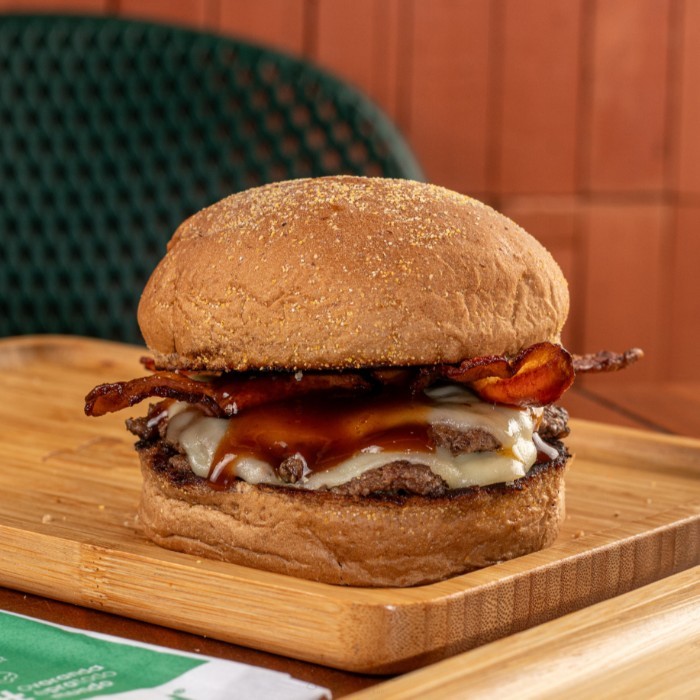 Dois burguers de 160g no pão australiano, cobertos com duas camadas do nosso cheddar cremoso, bacon em tiras, cebola caramelizada e farofa com bacon. É o tipo de lanche que não passa despercebido. Corpo de monstro, alma de clássico. [os burguers tradicionais do varanda possuem 160g in natura] [as imagens são meramente ilustrativas]