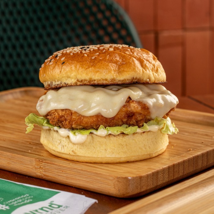 Simples? Só na foto. Pão com gergelim, burguer de frango empanado no ponto certo, queijo mussarela derretido, alface crocante e o aioli da casa que levanta qualquer moral. Crocrância por fora, suculência por dentro — e aquele sabor de “quero outro”.