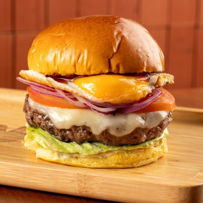 Tá querendo um burguer completo? Aqui tem tudo: ketchup da casa, maionese verde, alface, tomate, cebola, ovo frito e mussarela. Uma lenda do Varanda. _[os burguers tradicionais do varanda possuem 160g in natura]_ _[as imagens são meramente ilustrativas]_