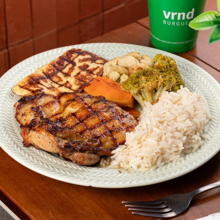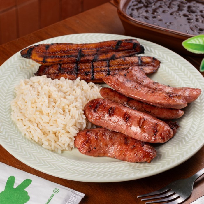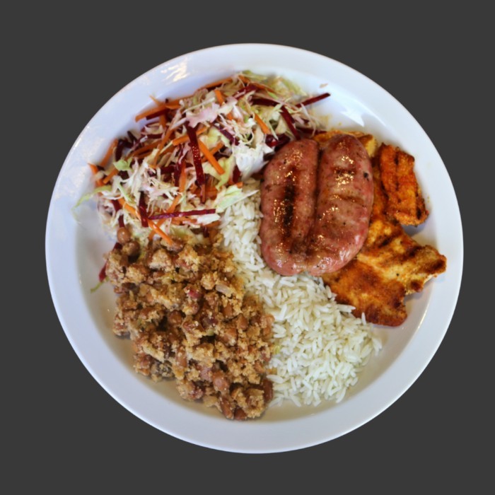Sertanejo: frango + toscana com arroz, feijão tropeiro e salada tricolor.
