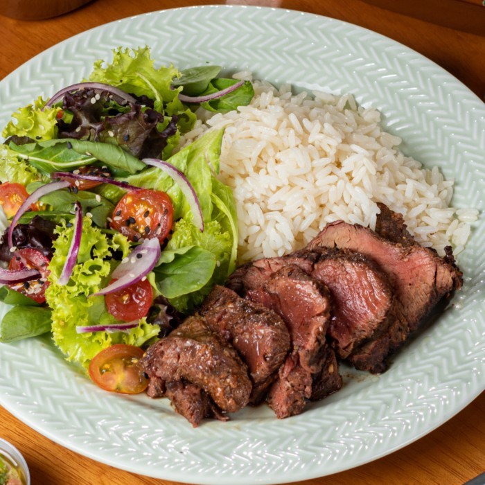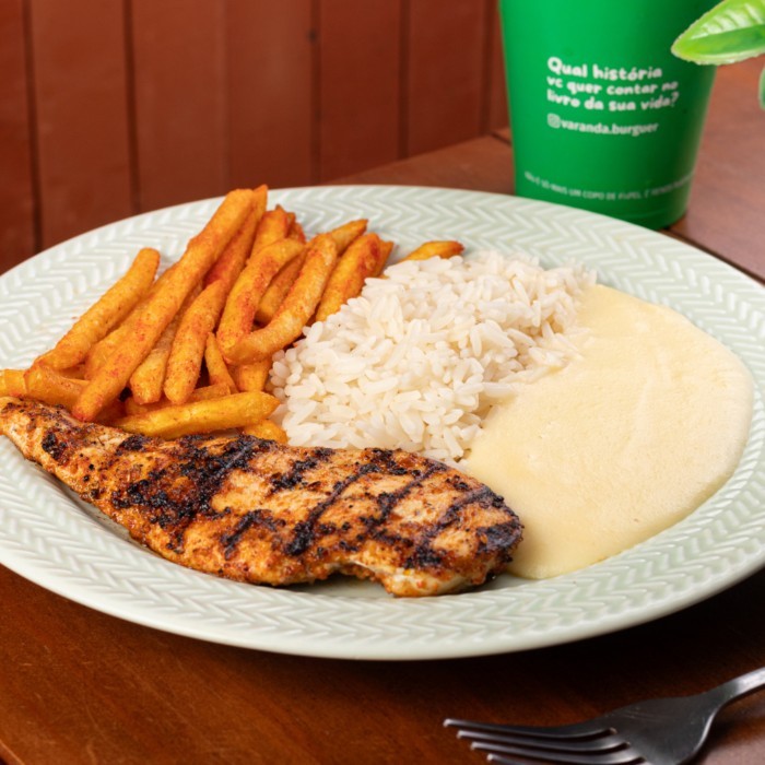Filé de Frango: arroz, feijão carioca e salada tricolor.