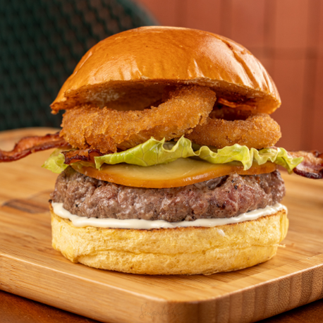 Pão brioche, burguer 160g, alface, queijo provolone, bacon, aioli da casa e anillos empanados.