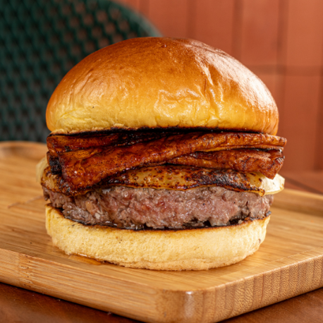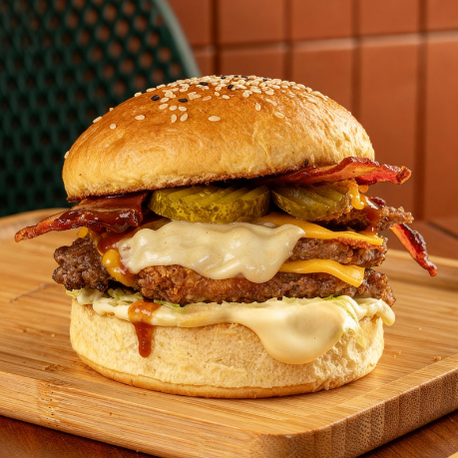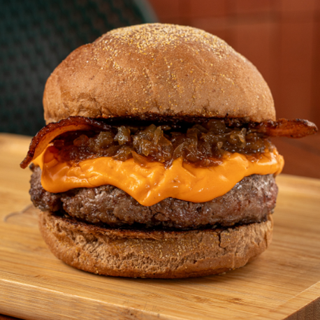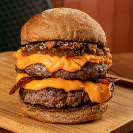 Pão australiano, 2 burguers de 160g, 2 camadas de cheddar cremoso do varanda, bacon em tiras, cebola caramelizada e farofa com bacon.