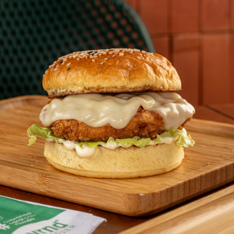 Pão com gergelim, burguer de frango empanado, queijo mussarela, alface e aioli da casa.