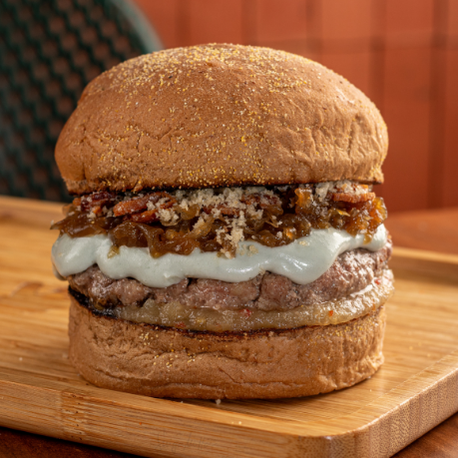 Pão australiano, burguer 160g, creme de gorgonzola, farofa com bacon, cebola caramelizada e geleia de abacaxi com pimenta.