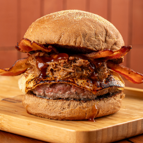 Pão brioche ou australiano, burguer 160g, queijo coalho derretido, costela bovina desfiada, molho barbecue e bacon.