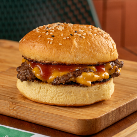 Pão com gergelim, 2 discos ultrasmash 50g, cheddar fatiado e ketchup da casa.