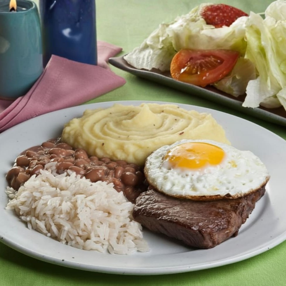 Bife e ovo frito acompanha arroz ou macarrão feijão salada ou purê de batata