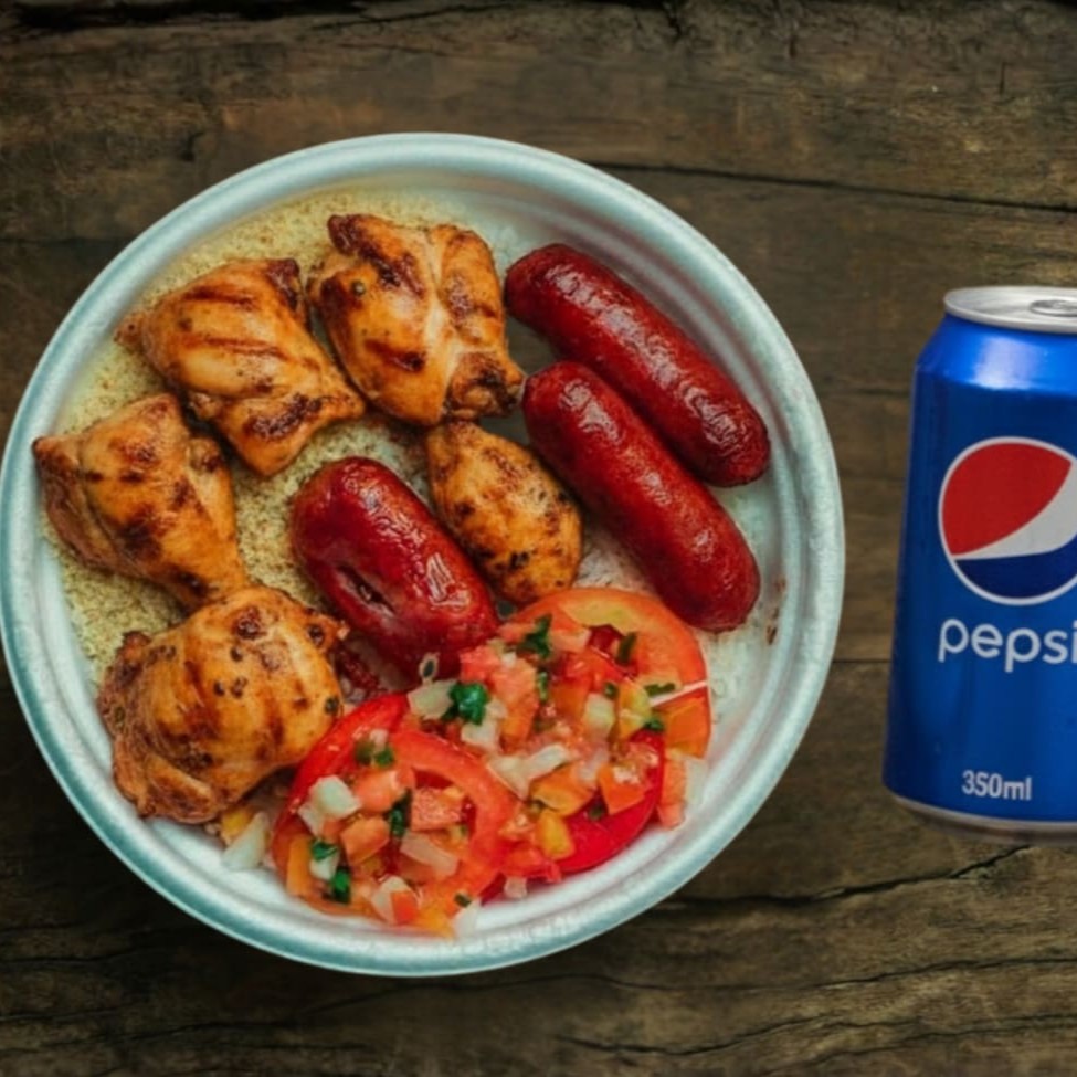 Churrasco misto suculento de frango e linguiça, acompanhado de arroz, macarrão, feijão e salada. Inclui uma Pepsi 350ml para completar sua refeição. Uma marmita completa e irresistível!