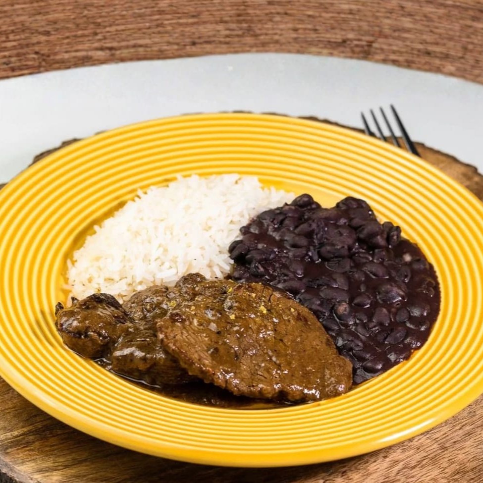 Bife macio e suculento coberto com molho saboroso, acompanhado de arroz, macarrão, feijão e salada. Uma marmita completa, farta e deliciosa, perfeita para o seu Dia!