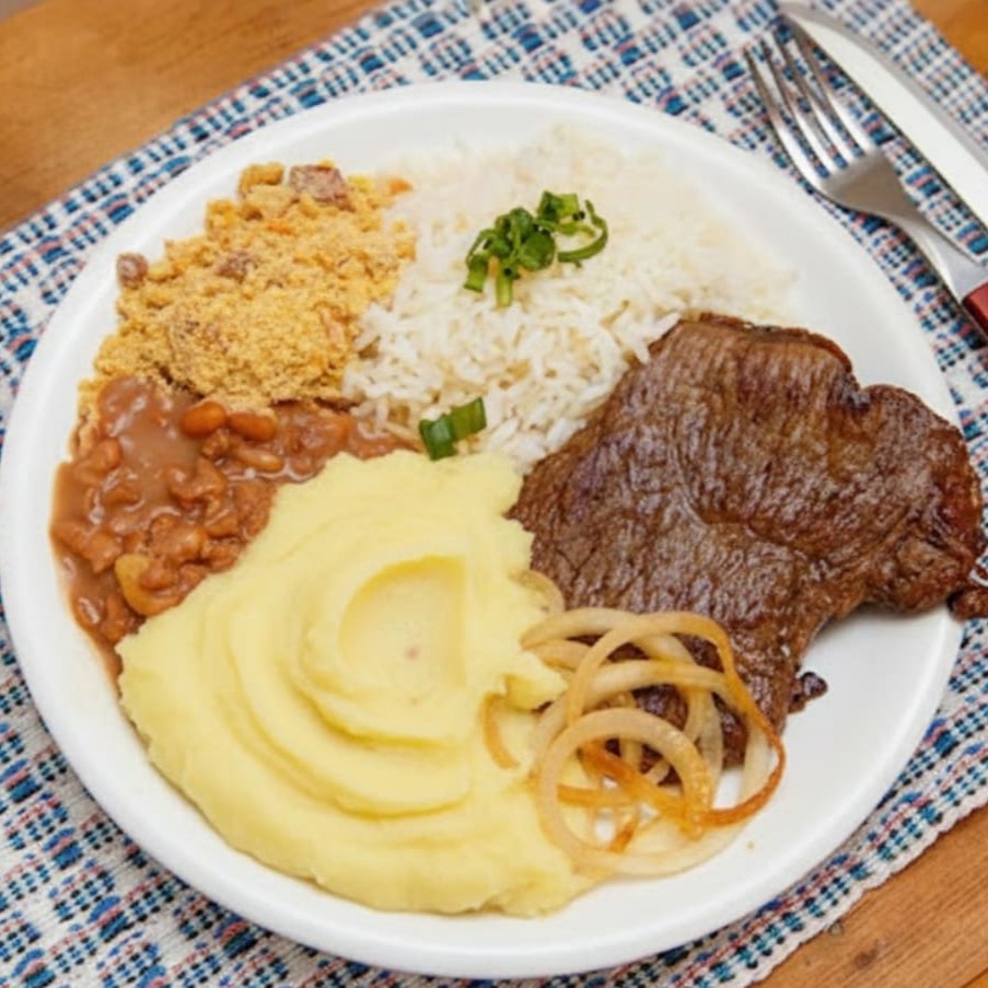 Bife acebolado suculento acompanhado de arroz, macarrão, feijão e salada . Uma refeição completa, caseira e bem servida, perfeita para matar a fome com muito sabor!