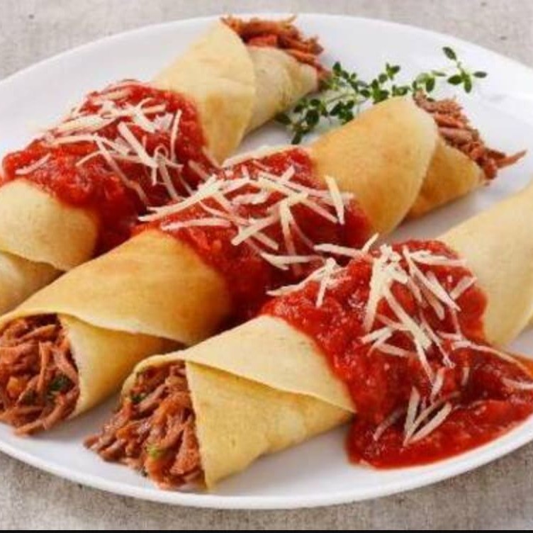 Panquecas de carne bem recheadas e saborosas, acompanhadas de arroz, macarrão, feijão e salada fresca. Uma refeição completa, caseira e deliciosa, perfeita para o seu almoço!