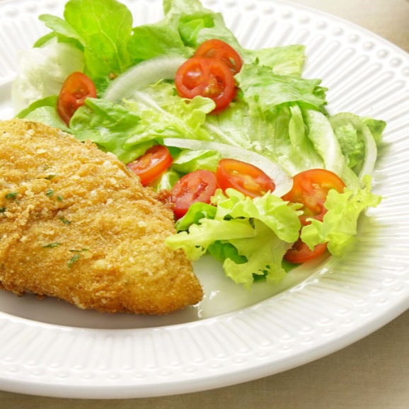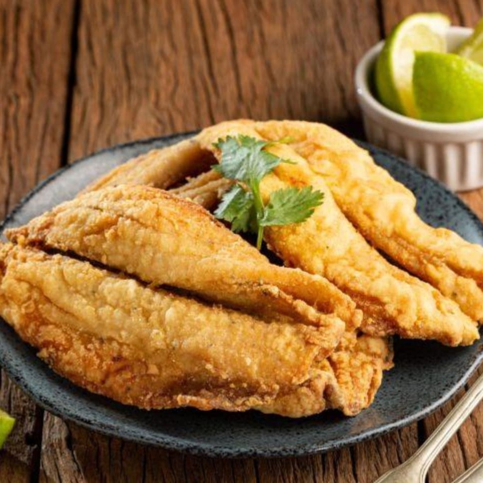 Filé de merluza empanado, crocante por fora e macio por dentro. Acompanha arroz, macarrão, feijão e salada . Uma marmita completa, leve e saborosa, perfeita para o seu almoço!