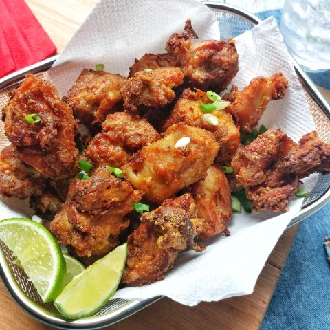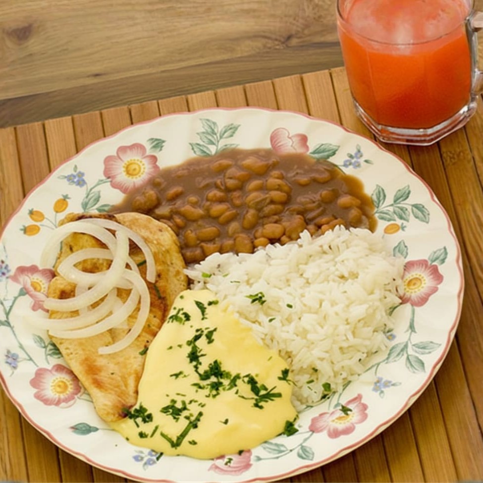 ! Frango acebolado bem temperado, suculento e cheio de sabor, acompanhado de arroz soltinho, feijão tropeiro e salada fresquinha.