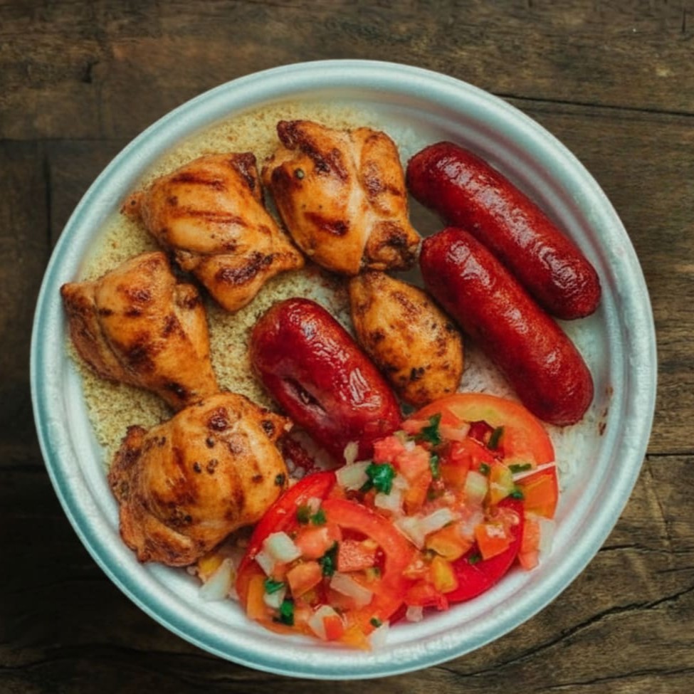 Sabor de churrasco todo Dia! Combinação deliciosa de frango e linguiça toscana, acompanhados de arroz, macarrão, feijão e salada. Uma marmita completa, suculenta e irresistível!